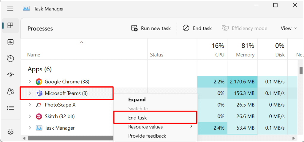 In Windows, press Ctrl + Shift + Esc to open the Task Manager, right-click Microsoft Teams, and select End task.