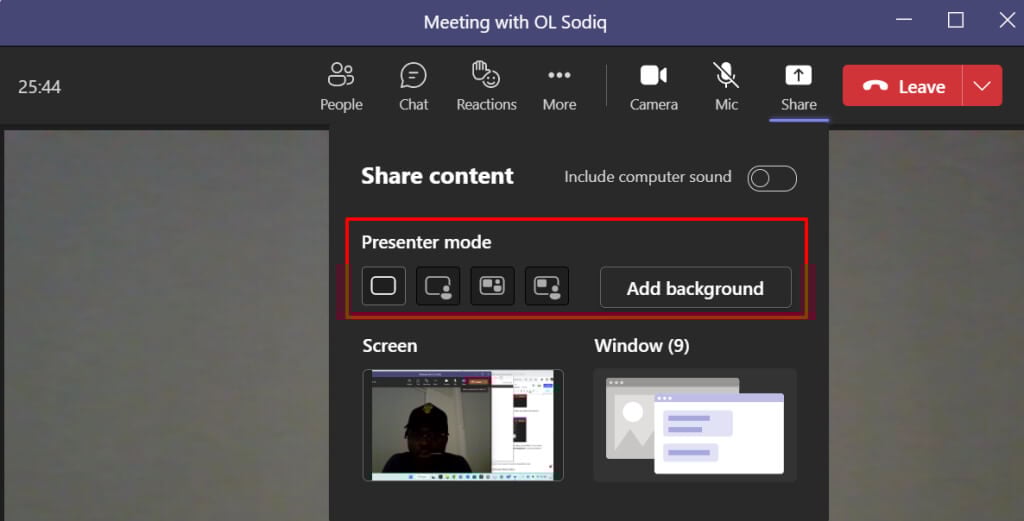 - Choose your preferred present mode and toggle on Include computer sound to also share your computer audio.