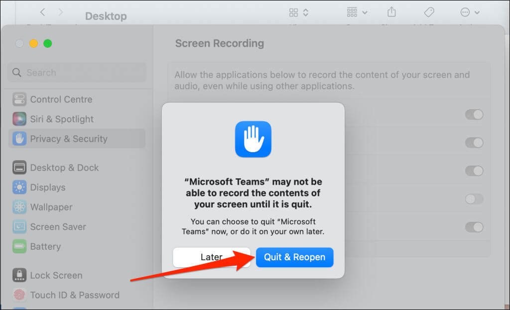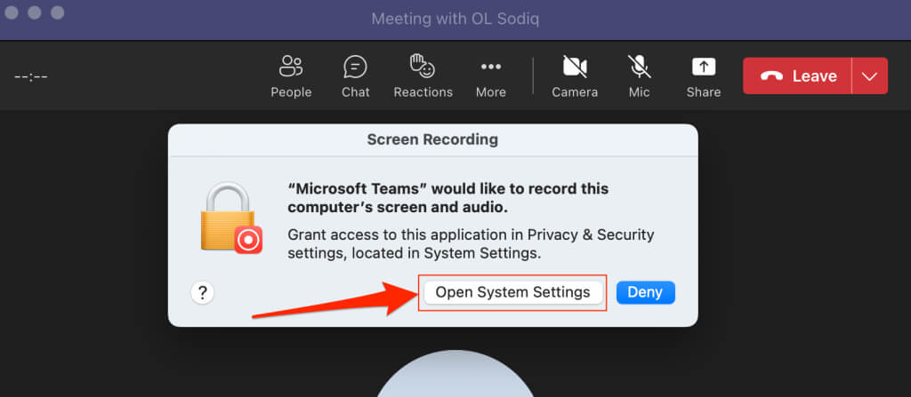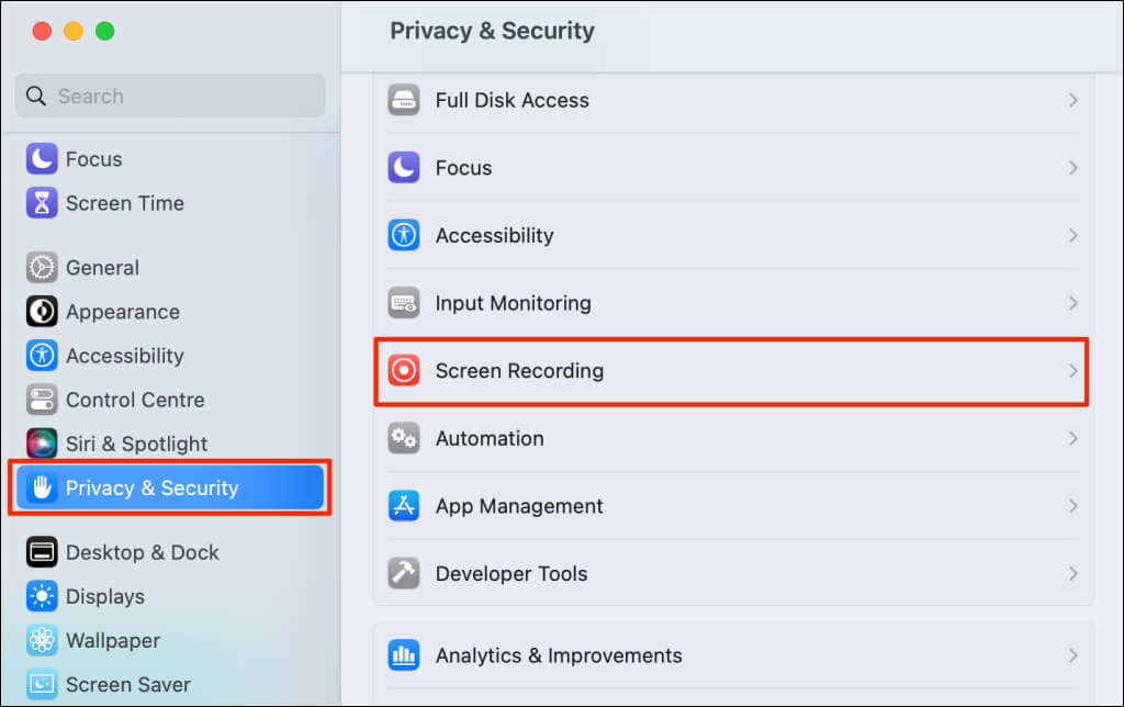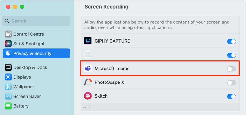 You can also grant Teams screen recording permission from your Mac’s system settings. Head to System Settings (or System Preferences), select Privacy & Security on the sidebar, and choose Screen Recording.