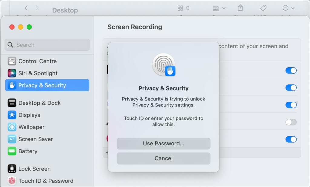 - Use Touch ID or select Use Password and enter your Mac’s password to proceed.
