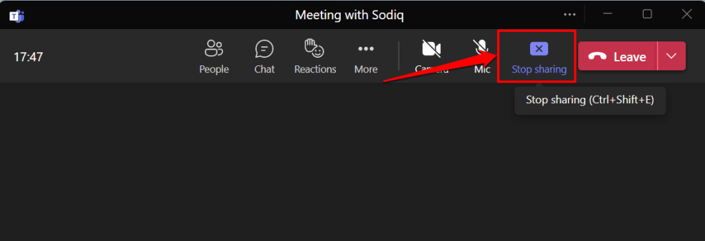 Open Teams and select the Stop sharing icon to stop sharing your screen.