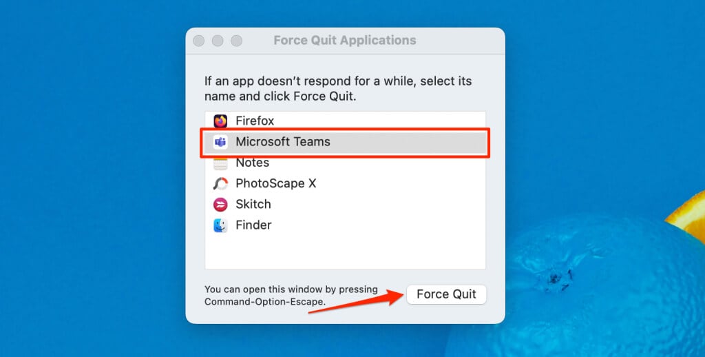 If you use a Mac, press Command + Option + Esc to open the “Force Quit Applications” window. Select Microsoft Teams and select Force Quit to terminate the Microsoft Teams app.
