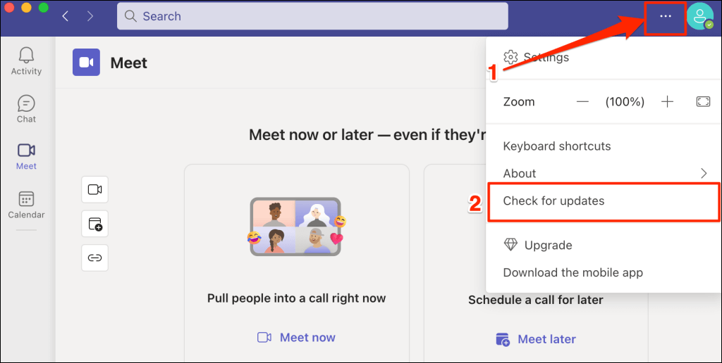 Open Microsoft Teams, select the three-dot icon next to your profile icon/picture, and select Check for updates.
