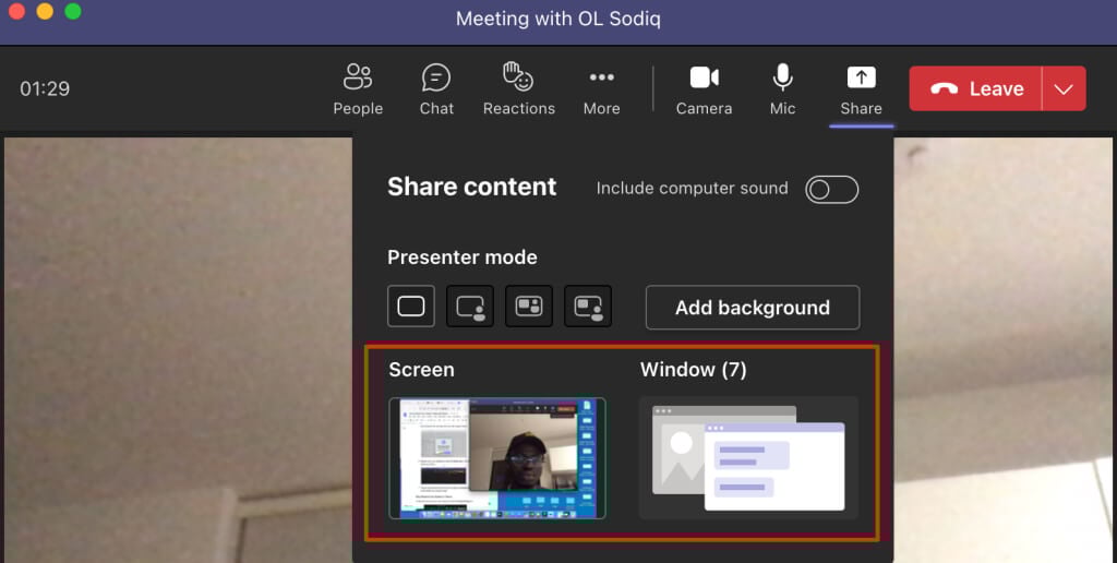 - Choose Screen to share everything on your computer’s display in the meeting. Alternatively, select Window to share a specific app.