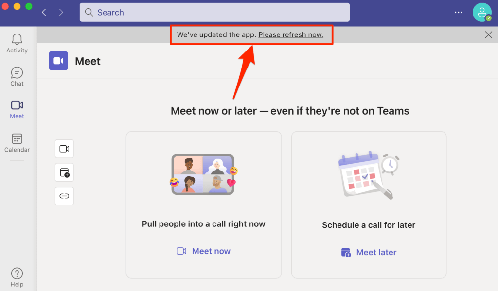 Wait for Teams to install available updates and select Please refresh now to restart Microsoft Teams.