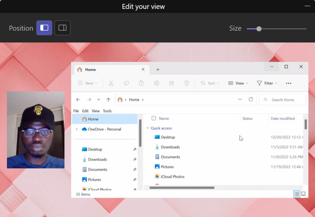 In Standout mode, meeting participants see you or whoever’s speaking in the bottom corner of the presentation. The screen or app window you’re sharing becomes the presentation background.