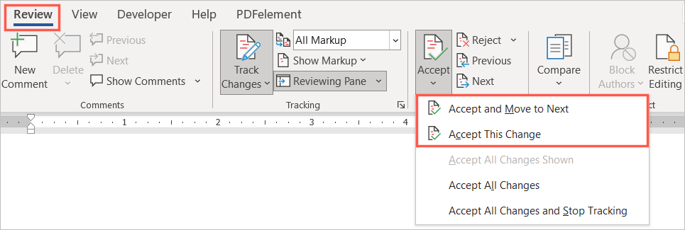 Choose either Accept and Move to Next to review and accept one at a time or Accept This Change to accept it and then stop the review process.