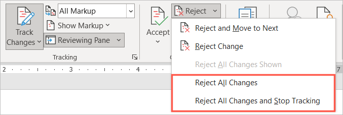 To reject all changes in the document, select the Reject drop-down arrow and pick Reject All Changes or Reject All Changes and Stop Tracking per your preference.