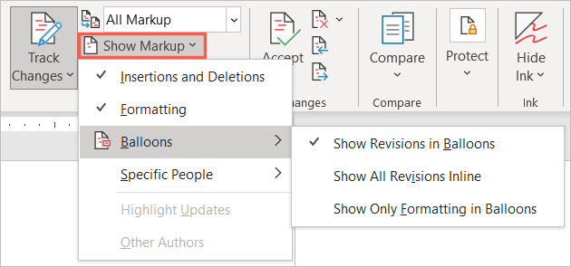 - Next, select the **Show Markup** drop-down arrow. Here you can adjust what you see and how it displays.
