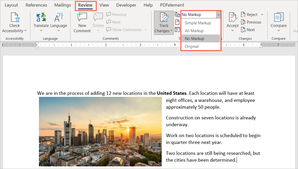 - Select the top drop-down box and choose either No Markup or Original. No Markup is the best option to see your document without edit indicators. Original shows precisely that—your original document as it was before any edits.