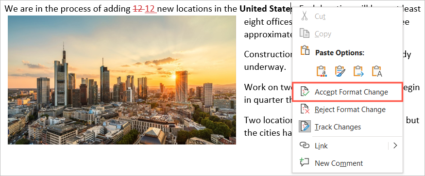 Alternatively, you can right-click a change and pick Accept for the insertion, deletion, or format change.