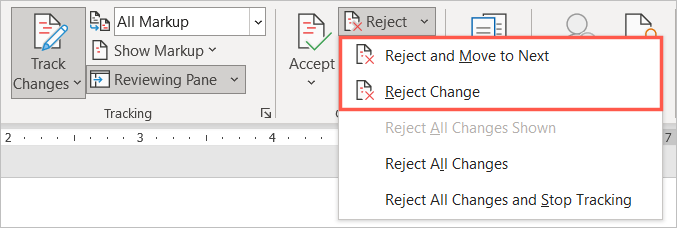 Pick a change, select the Reject drop-down arrow in the ribbon and choose **Reject and Move to Next or Reject Change. You can also **right-click and select Reject for the insertion, deletion, or format change in the shortcut menu.