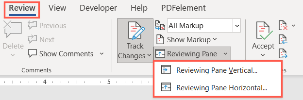 Select the Reviewing Pane drop-down arrow and pick either the vertical (left panel) or horizontal (bottom panel) option.