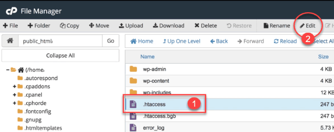 Once you have made your copy, you are now ready to edit the file. In your cPanel File Manager, right-click the .htaccess file and click edit.