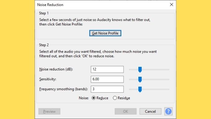 - Look for a button labeled “**Get noise profile**” and select it. * Now, select the entire track. * Go to **Effect>Noise reduction**. * Leave the settings at their default and then select **OK**.