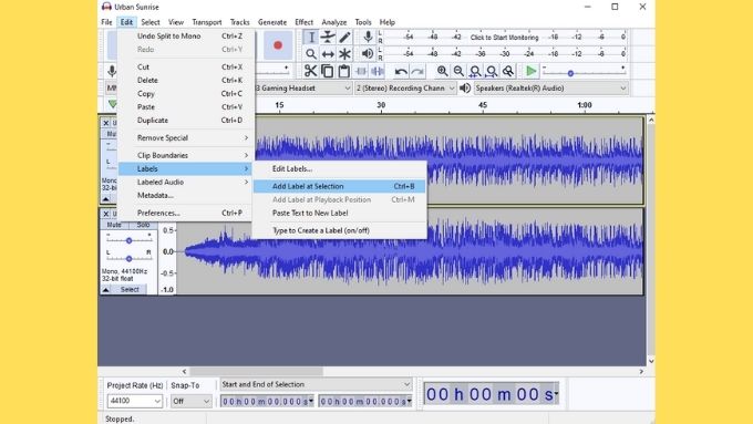 - Select **Edit **>** Labels **>** Add Label** at selection then give the first track its name.