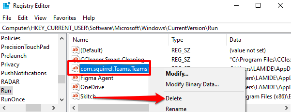 Windows creates a registry file for startup programs on your computer. You can stop an app from opening automatically by deleting its startup file in the Windows Registry. Follow the steps below to delete Microsoft Teams’ startup file.