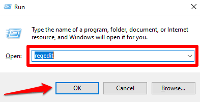 - Launch the Windows Run box (Windows key + R), type regedit in the dialog box, and click OK.