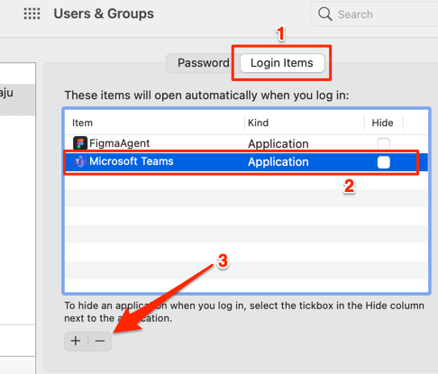 Go to the Login Items tab, select Microsoft Teams from the list, and click the minus (—) icon.