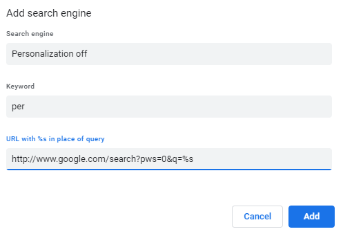 Next, click Add just above Other search engines, and then enter the information provided below into the specified fields: * Search engine – Personalization off – Google