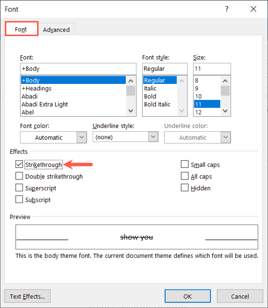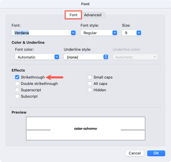 In the Font box that appears, make sure you’re on the Font tab. Mark the checkbox for Strikethrough and select OK. Just like on Windows, you can use the Double Strikethrough option as well.