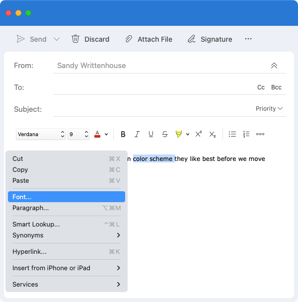 Type your text in a new email, reply, or forward. Then, select the text by dragging your cursor through it and do one of the following. * Right-click and choose Font.