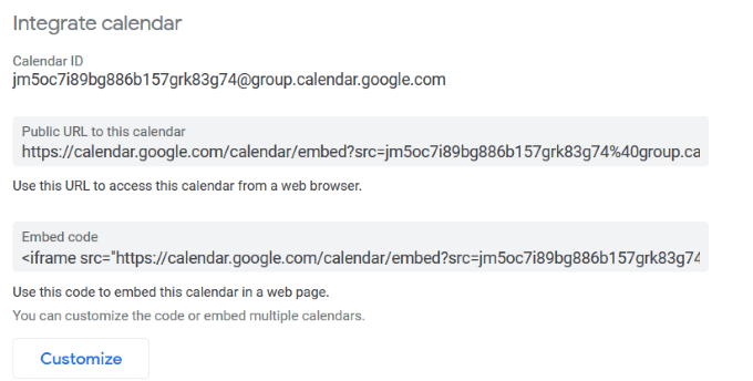 - Look for **Integrate calendar **under settings and sharing. You will have to scroll down the page to find it.