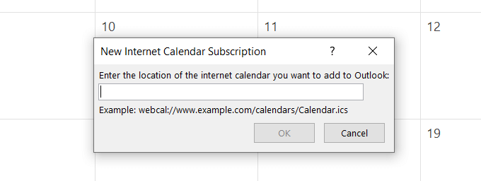 - Paste the Secret address in iCal format URL that you copied above in the space provided (see screenshot below) and click OK.