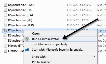 When you try to check the Autostart button, you will get a message saying you have to start Dsynchronize as an Administrator. In order to do this, close the program and then right-click on the application file and choose Run as Administrator.