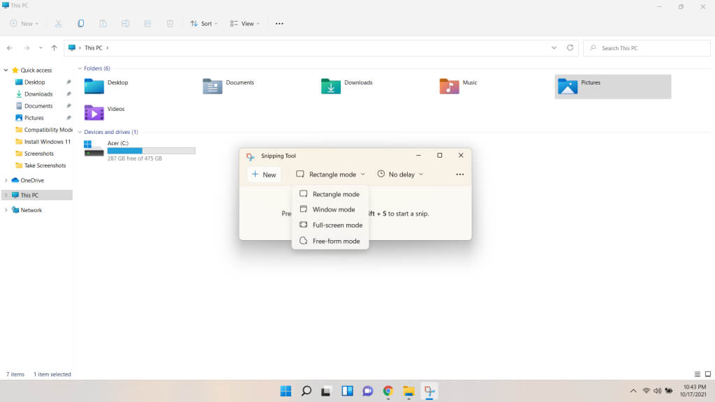 - You can switch between snipping modes from the drop-down menu in the middle, which gives you the same options that come up when using the keyboard shortcut.