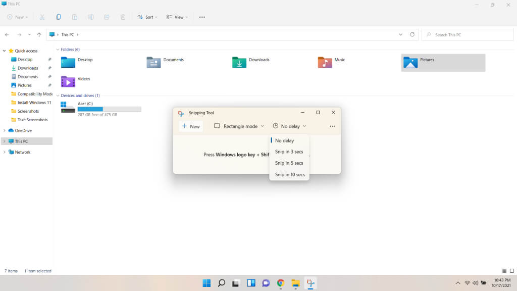 - Another thing you can do from the Snipping tool is to set a delay. This allows you to take screenshots of things that close when another app is opened, such as opening menus or hovering over an option. And unlike the Windows key + PrtScn shortcut, you only have to take snips of the important parts.