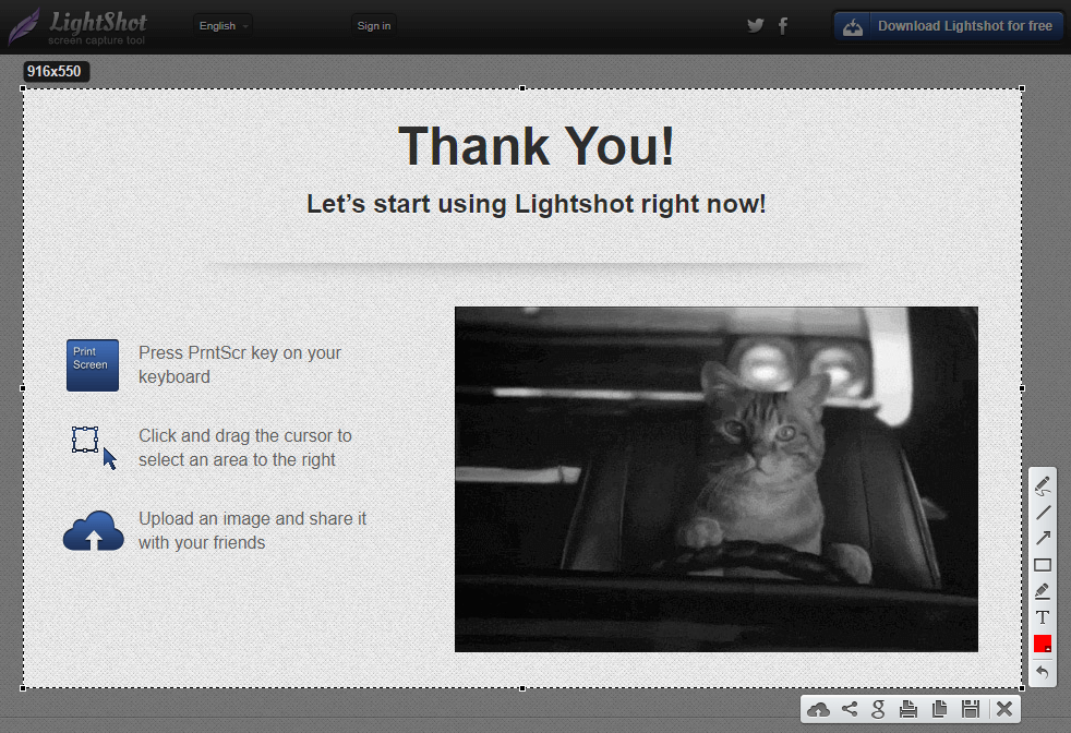 Click and drag to select an area, and LightShot will give you a few annotation tools and ways to save or share your screenshot quickly.