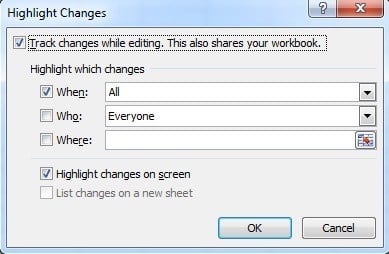 If you check Who, you can choose to track changes made by anyone or changes made by everyone except you. The Where option allows you to track changes only for a specific portion of the spreadsheet. Just click the button at the right and select the range of cells you want to keep track of.