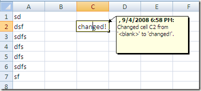 Also, if you click on a changed cell (with Highlight changes on screen turned on), you’ll get a little popup window showing what the value was changed from and changed to and at what time. If you deselect the Highlight changes on screen option, that little black triangle won’t show up.