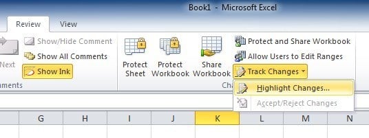 Click the button and choose Highlight Changes. You’ll get a dialog box where you now need to check off the option “Track changes while editing. This also shares your workbook”.