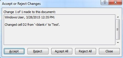 Click OK and Excel will begin to show you each change that was made and give you the option to Accept or Reject. You can also Accept All or Reject All changes if you like.