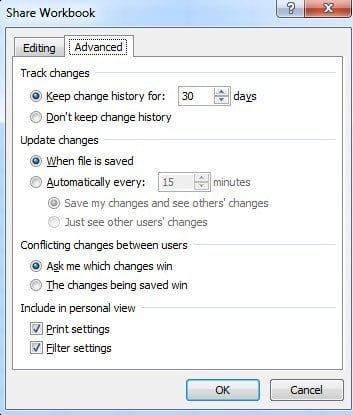 The next step is to take a look at the settings for tracking and adjust them to fit your needs. To do this, click on the Share Workbook button that is directly to the left of the Track Changes button. Click on the Advanced tab when the Share Workbook dialog pops up.