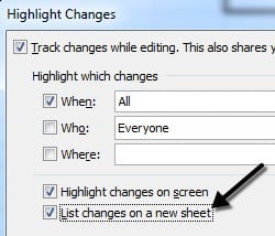 Once you have enabled tracking and made a few changes, you can click on the Track Changes button again, click on Highlight Changes and you’ll notice that the** List changes on a new sheet** box is no longer grayed out.