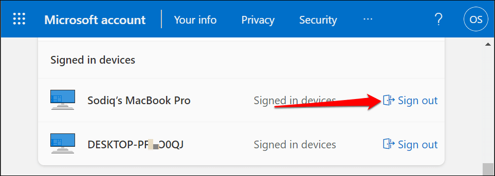 - In the “Signed in devices” section, select **Sign out** next to the device whose Office license you want to deactivate.