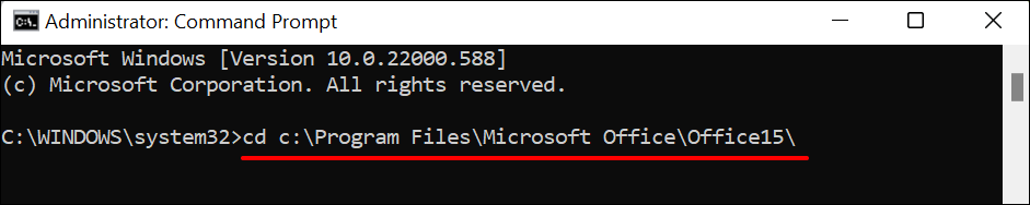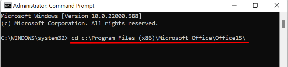 If Office 2013 is installed on a 64-bit PC, type or paste cd c:Program FilesMicrosoft OfficeOffice15 and press Enter.