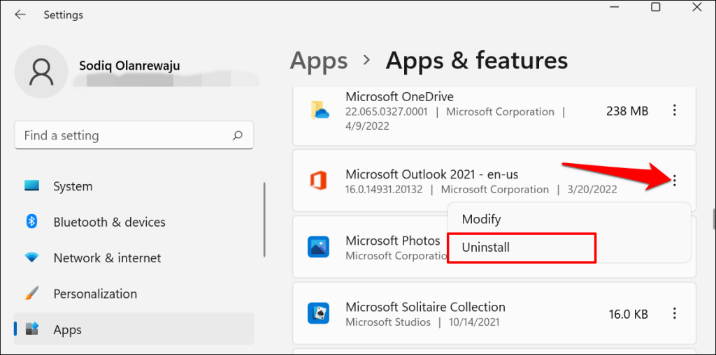 - Go to Settings > Apps > Apps & features, select the three-dot icon next to the Office app, and select Uninstall.