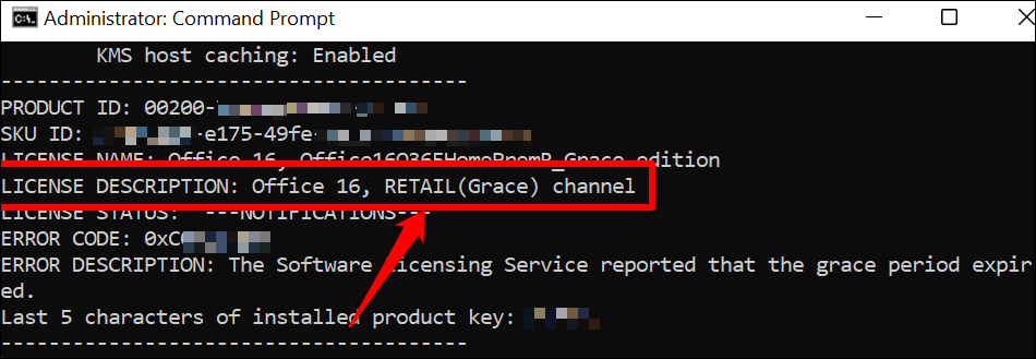 - Type or paste **cscript ospp.vbs /dstatus** and press **Enter**.