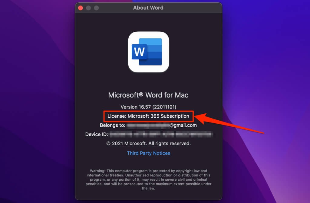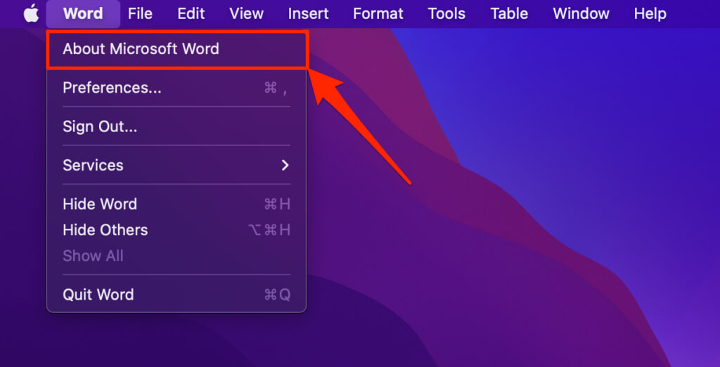 - Select the product name on the menu bar and select About [Product Name]. For example, if you’re using Microsoft Word, select Word on the menu bar, and select About Microsoft Word.
