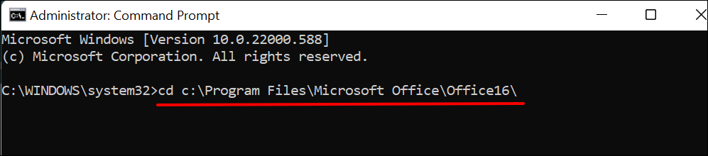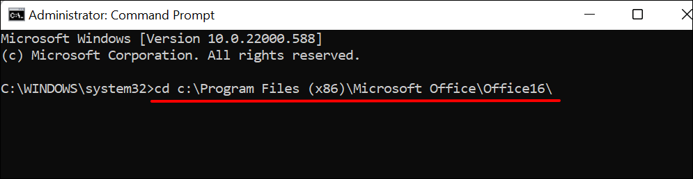 On a 64-bit computer, type or paste cd c:Program FilesMicrosoft OfficeOffice16 in the terminal and press Enter.