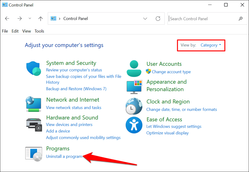 - Open your PC’s Control Panel and set the “View by” option to Category. Select Uninstall a program in the “Programs” category to proceed.