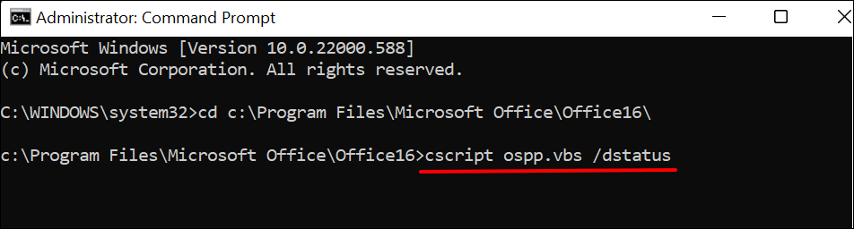 - Next, type or paste cscript ospp.vbs /dstatus in the terminal and press Enter.