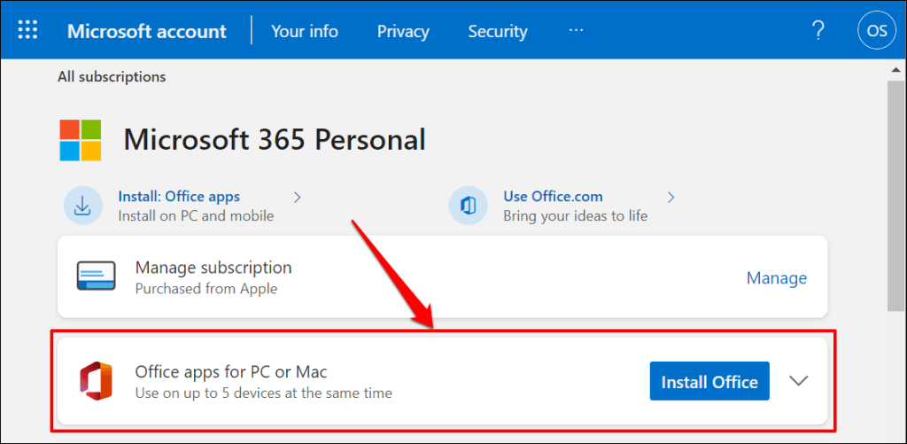 - Expand the **Office apps for PC or Mac** drop-down menu.