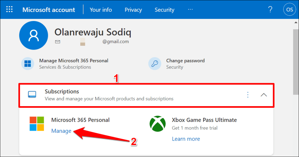 - Sign in to your Microsoft Office account on any web browser. Expand the Subscriptions drop-down menu and select Manage below your Microsoft 365 subscription.