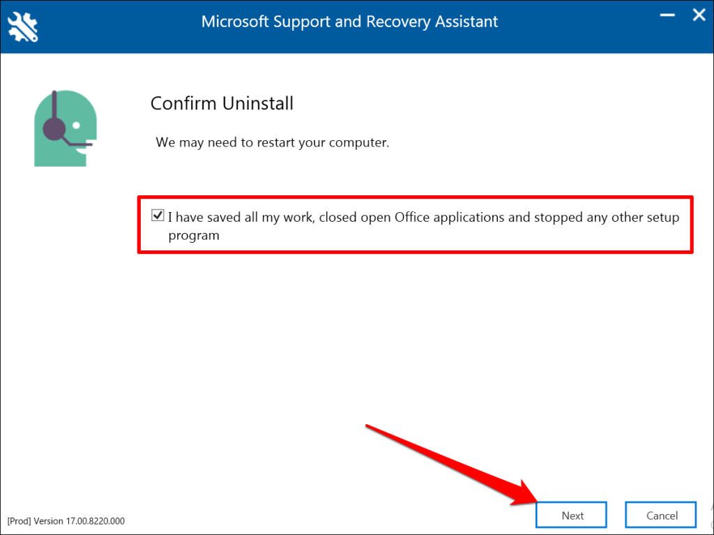 Confirm that you’ve saved your work and closed all active Office applications. Select Next to start the uninstallation.