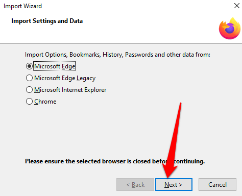 - From the **Import Wizard**, select the **browser** you want to transfer your bookmarks from and into Firefox. The browser options available will depend on the browsers installed on your computer, and those that are compatible with the Firefox import functionality.